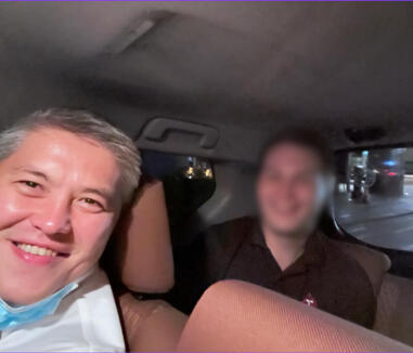 Here's Tim and I driving in a taxi from the client's site (Tim is not a public person, that's why I blured his face)